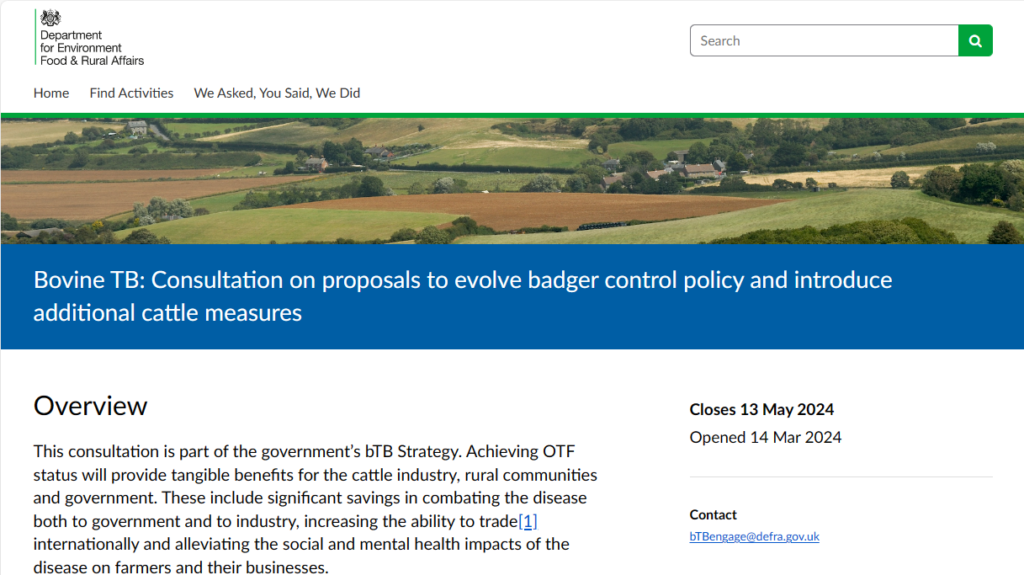 Defra has extended the consultation period to 13 May – a three week extension. This is already clear on some parts of the Defra website, for example https://consult.defra.gov.uk/bovine-tb/bovine-tb-consultation-wildlife-cattle/ :