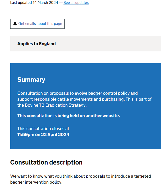 But not on the page at which you are more likely to arrive if you simply search for the consultation https://www.gov.uk/government/consultations/bovine-tb-future-badger-control-policy-and-cattle-measure-proposals :