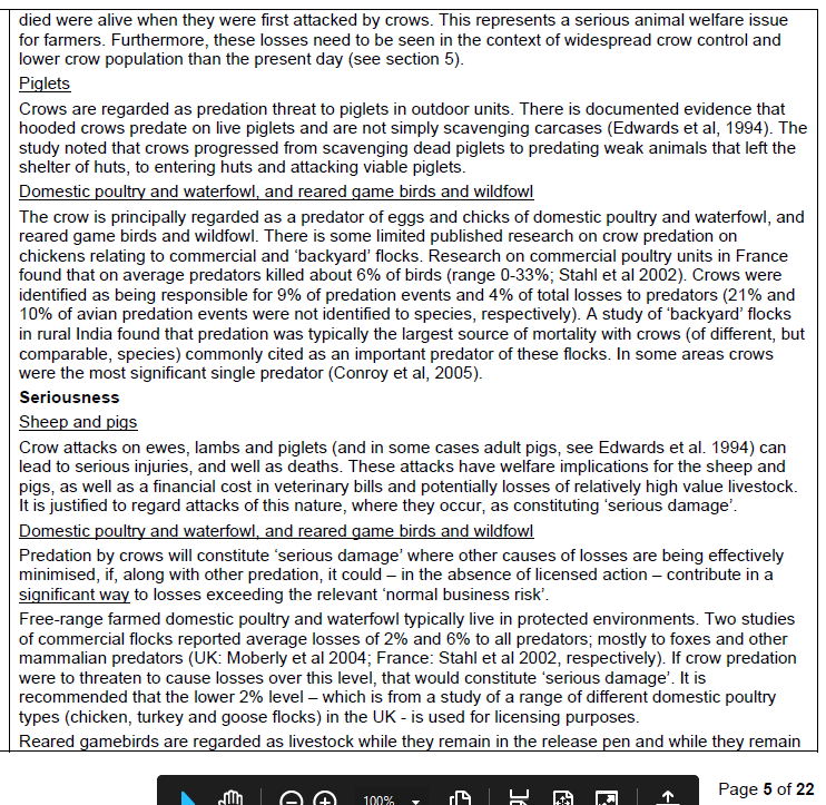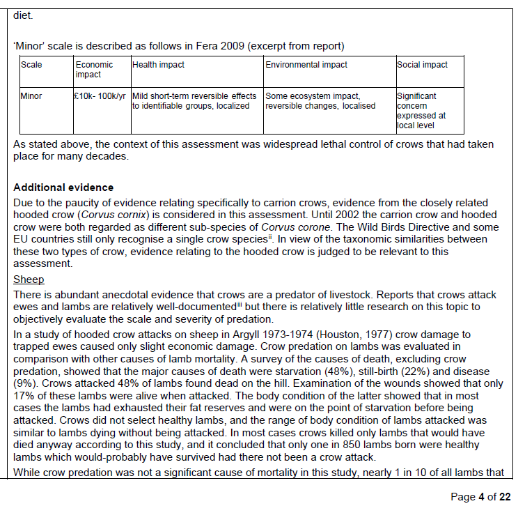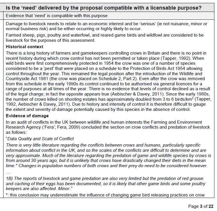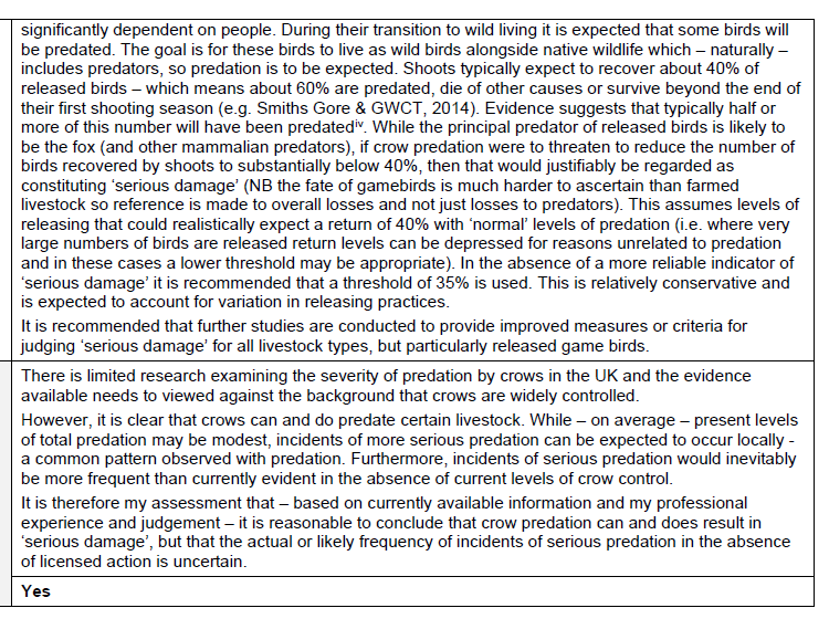 This is the section in the Licence Determination document received from Natural England to justify the publication of General Licence GL26 to ‘authorise’ control of Carrion Crows to prevent serious damage to livestock including gamebirds (Pheasants and Red-legged Partridges).