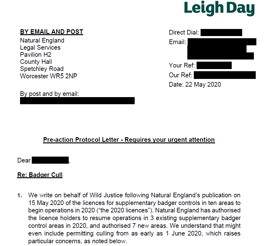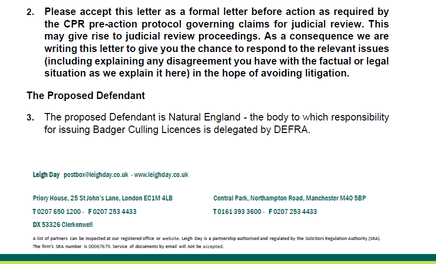 You can see that the beginning of the letter sets out what the letter is and names Natural England as the proposed defendant in any legal case.