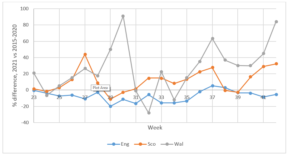 Figure 1. Percentage differences between weekly reporting rates in June – October (weeks 23 to 42) in 2021 and the average for the same weeks in 2015-2020.