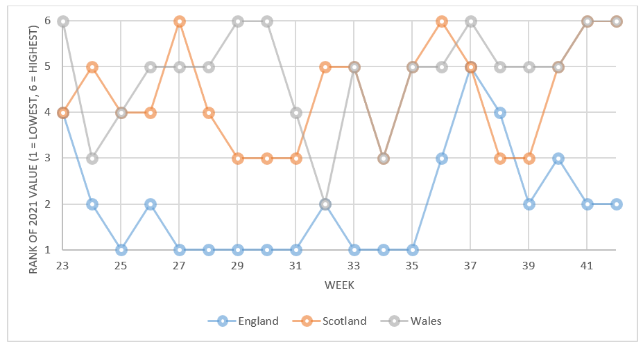 The same pattern was apparent when post-regulation reporting rates were compared with pre-regulation reporting rates using ranks (to account for the fact the pre-regulation average might have been unduly influenced by extreme values). Fig. 2 shows that for England, weekly reporting rates post-regulation were generally among the lowest recorded in the period 2015-2021 (mean rank = 2.0), whereas in Scotland and Wales they tended to be above the median rank (mean ranks of 4.4 and 4.9 respectively).