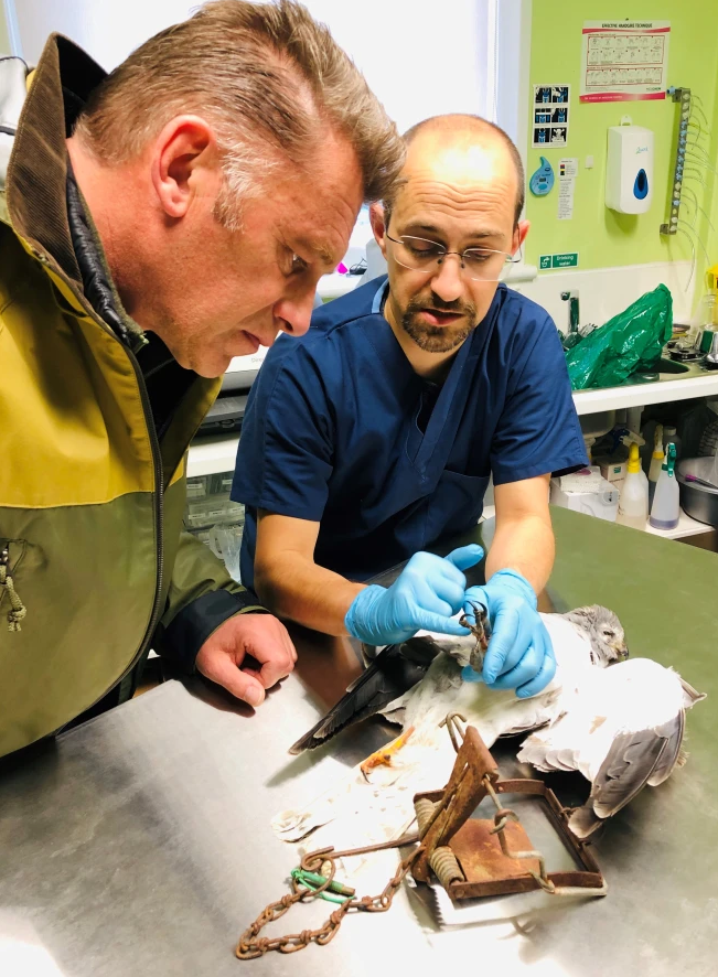 Chris Packham and vet Romain Pizzi, inspecting the injured Hen Harrier after being released from the spring trap. Sadly he couldn’t be saved. Photo: Ruth Tingay
