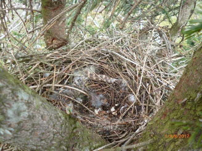 The fieldworkers were disappointed when, on their next visit to the site, they saw none of the signs of activity you’d expect from an active Merlin nest. When they climbed up to the nest to investigate, all four eggs were found smashed, congealed with tufts of feathers from an adult bird. Further searching revealed fresh damage to the tree around the nest; splintered wounds were found on branches and pieces of bark were retrieved from the nest along with the eggs and feathers.