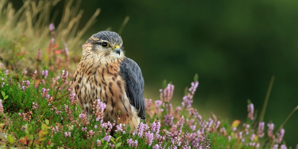 One of these is the Merlin, our smallest bird of prey in the UK. Merlins are compact and speedy birds of prey, found in the uplands in spring and summer. Smaller than wind-hovering Kestrels, they zoom around moorland after small prey such as moths and birds like Meadow Pipits and medium-sized song birds like Skylarks. It’s much less likely that Merlins will attempt to predate Red Grouse, with adult grouse weighing twice as much as these lightweight falcons. For this reason, they’re not often the victims of direct persecution (although sometime they’re inadvertently killed in traps set for other species), with gamekeepers preferring to target grouse-eating species like Hen Harriers and Peregrine Falcons.