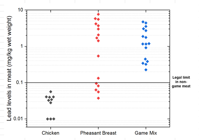 · Tests on packets of pheasant breast and mixed game meat from Sainsbury’s found lead levels at up to 76 times higher than the legal limit set for beef, pork, chicken etc.