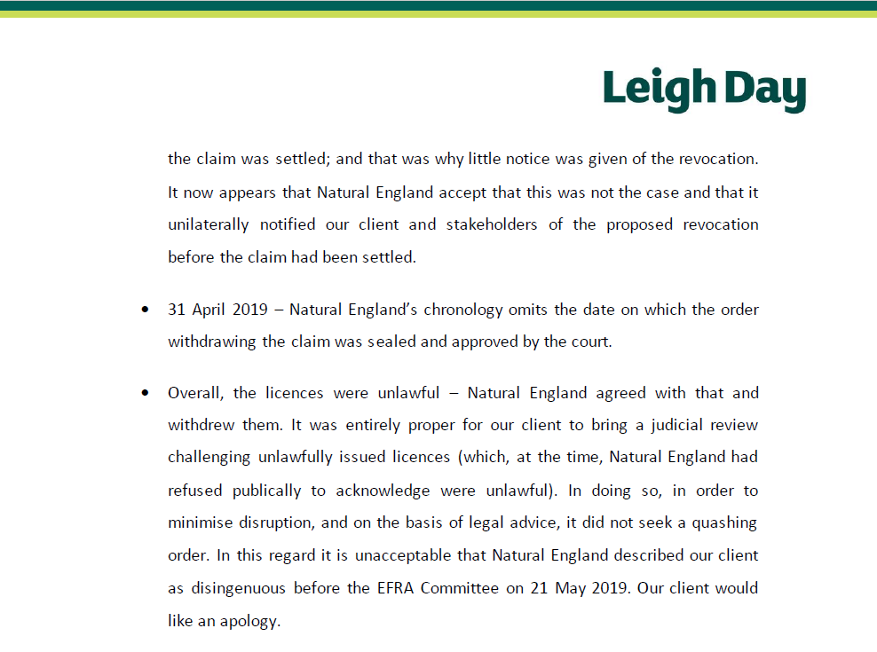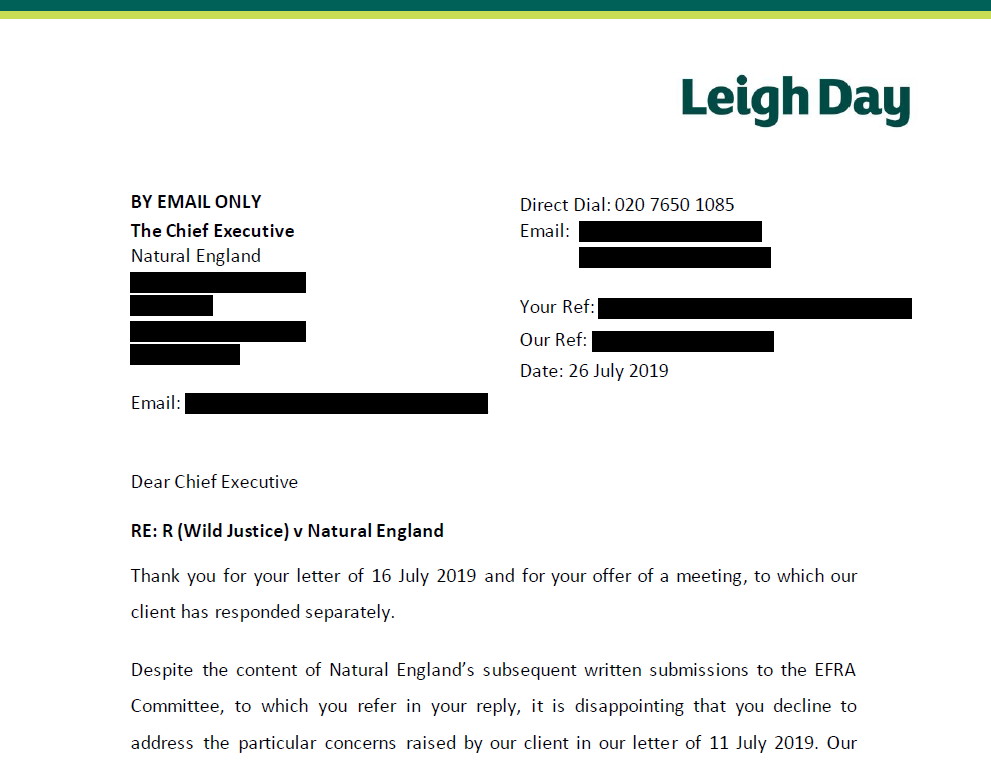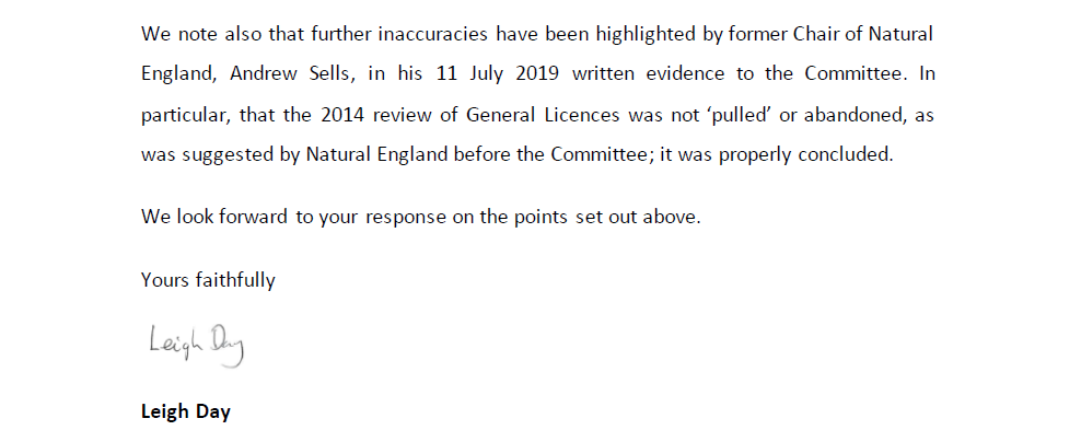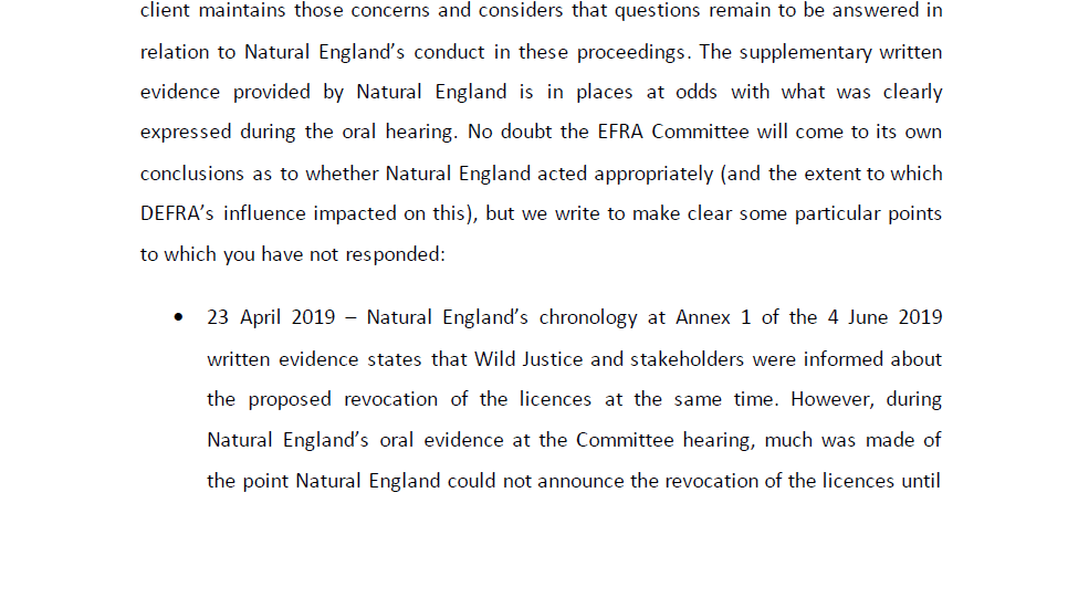 On Friday, our lawyers sent the following letter to Natural England regarding their evidence to the Efra Committtee and their conduct towards Wild Justice.