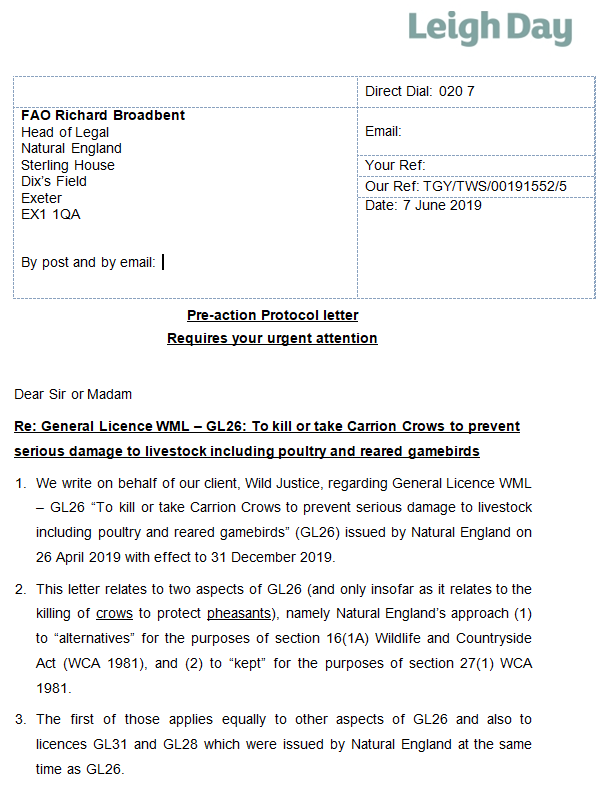 On Friday morning Wild Justice launched a new legal challenge of general licences issued by Natural England.
