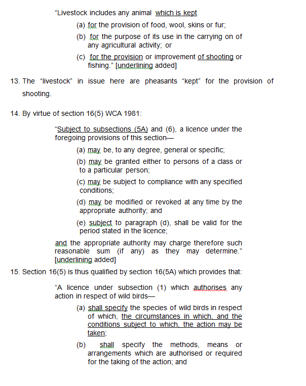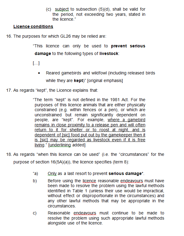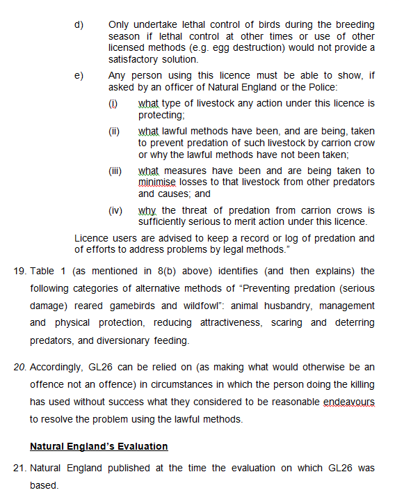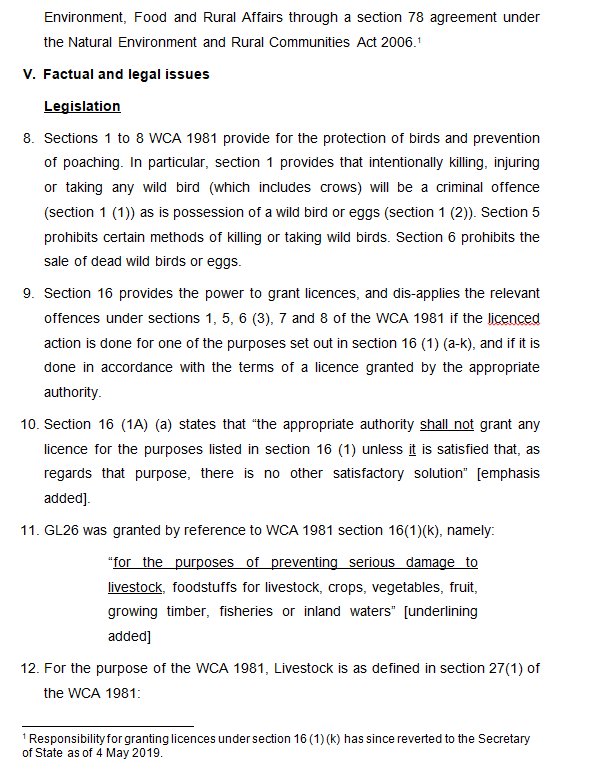 Wild Justice is challenging two aspects of GL26 (and only insofar as it relates to the killing of Carrion Crows to protect Pheasants), namely Natural England’s approach (1) to “alternatives” for the purposes of section 16(1A) Wildlife and Countryside Act (WCA 1981), and (2) to “kept” for the purposes of section 27(1) WCA 1981.