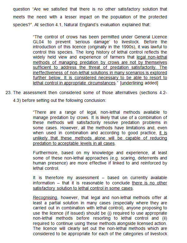 Licence GL26 is a shoddy document. It is scientifically threadbare and, we contend, legally flawed. It does not form a sound basis to justify widespread, unmonitored, unlimited control of Carrion Crows to protect livestock. We are glad that Defra has promised a proper review of licensing of the killing of wild birds because, on the evidence of this licence, that killing often amounts to unjustified casual killing. We call upon Defra to announce the date and substance of that review as quickly as possible so that these matters can properly be examined before 2020’s licences are issued. We also repeat our call to Defra not to issue any general licences to allow the lethal control of Jay, Jackdaw, Rook or Magpie for the purpose of protecting wild birds. But now we are asking for the elements of GL26 which relate to protection of Pheasants and other gamebirds to be quashed and those elements which relate to other livestock to be thoroughly scrutinised in the review of general licences promised by Defra.