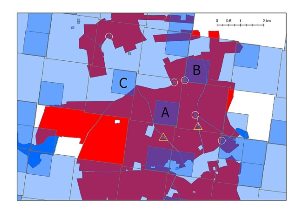 Fig. 1. Reconstructed grid cells, showing the different classes of precision of confirmed presence of Common Pheasant (larger blue squares 2-km, medium blue squares 1-km, small blue squares <100m) overlaying part of a Natura 2000 site (Breckland, in red). The white areas are those with no records of Pheasant in the dataset used. In this example, none of the 2-km cells falls entirely within the Natura site polygon, but one of the 1-km cells (“A”) and several of the smallest cells (circled in white) fall entirely within it. Note that due to the very high precision of mapping of Natura sites, with sites broken into multiple small polygons and even roads and individual fields excised from the site, cells such as that labelled “B” and the 2-km cell immediately below it, which fall entirely within the outermost boundary of the site, do not entirely fall within the site’s polygon because of the tiny proportion of their area falling on roads; even two of the highest-resolution cells (in yellow triangles) are not entirely included in the site’s polygon for the same reason.