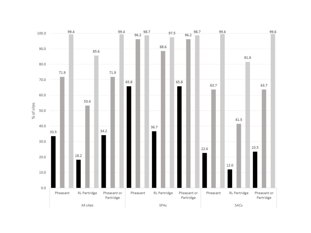 Technical Summary Terrestrial Natura 2000 sites in England were intersected with an irregular grid of post-2000 records of Common Pheasant and Red-legged Partridge, each cell scaled according to the spatial precision of the record(s) within it (maximum cell size = 2×2 km). Of the 313 Natura 2000 sites in England that have a terrestrial component, 33.5% entirely contained one or more cells with confirmed presence of Pheasant, 71.9% contained the central points of one or more cells with confirmed presence and 99.4% (all but two Natura sites) overlapped one or more cells with confirmed presence of Pheasant. The equivalent values for Red-legged Partridge were 18.2%, 53.4% and 85.6%, respectively. The average percentage of the land area of terrestrial Natura 2000 sites in England that fell within grid cells occupied by Pheasant was 93.0% (45.6% for Red-legged Partridge), and for a dissolved layer total land area of all SPAs and SACs combined, taking out the overlap between sites, it was 72.1% (31.9% for Red-legged Partridge). Pheasants are therefore present within, or immediately outside, practically all the terrestrial Natura 2000 sites in England, and Red-legged Partridges are present within, or immediately outside, a majority.