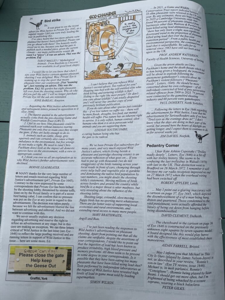 But then in the last (current) issue of Private Eye the magazine attempted to justify its position but also printed this page of letters supporting Wild Justice’s advert;