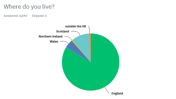 - Wild Justice’s newsletter subscribers are slightly under-represented in Northern Ireland and slightly over-represented in Scotland (but not by much)