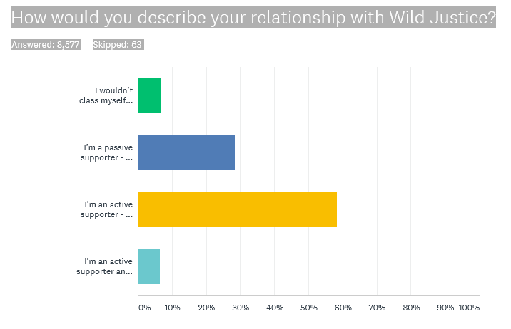 - Q5: why don’t you have a membership fee like most other conservation organisations? A: we aren’t like most other conservation organisations! Our newsletter is free – anyone can subscribe. If you like what we do then we think you’ll support us financially and we’d rather leave the amount entirely up to you. If you think we’re doing good work then please support us, but if you don’t, keep an eye on us and we might well amaze you in the future and then you can give us money if you feel that way. We could wind up Wild Justice very quickly if the money stopped coming in for our work, and if you don’t like what we do then that’s what we would have to do. We don’t have land, offices, permanent staff, salaries, pensions, stock or any of those things that we need to fund. We pay our bills on time – usually on the day they are rpesented to us and we don’t have any debts. At the moment, thousands and thousands of people like what we are doing and want to support us – we’ll trust that as our financial model for at least a while.