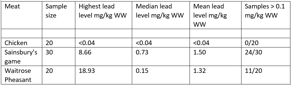 Yesterday we showed you the results of lead analyses of Sainnsbury’s chicken meat and two game products; Game Mix and Pheasant breasts. In the table below those findings are reproduced with the two types of Sainsbury’s game meat combined on one line and the Waitrose data added.