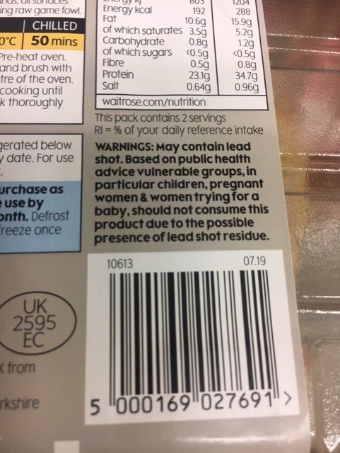 Wild Justice spent some time talking to journalists about this matter yesterday. Waitrose told a journalist that ‘game continues to be labelled for lead as per Food Standards Agency requirements‘ which is being unduly modest of them, since there are no FSA requirements to label game meat in that way. If there were, then Sainsbury’s and every other supermarket would be doing it, and it is, to the best of our knowledge, only Waitrose. So well done Waitrose.