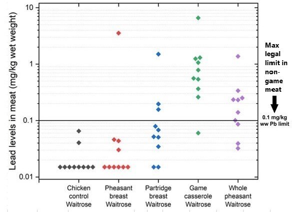 One of ten Pheasant breasts, three of ten Partridge breasts, six of ten whole Pheasants and nine of ten game casseroles contained high levels of lead exceeding the maximum legal limit in non-game meat – some of the levels were very high.