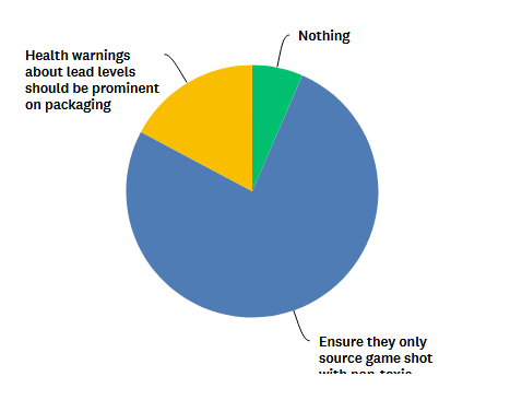 Most of you think that government should ban lead ammunition (and so do we) and your view is, we guess, influenced by the fact that lead ammunition has environmental impacts as well as health impacts. Very few people (6%, many of them clearly shooters from their comments) think that it is OK for government to do nothing. Will DEFRA stop dragging its feet on this issue?