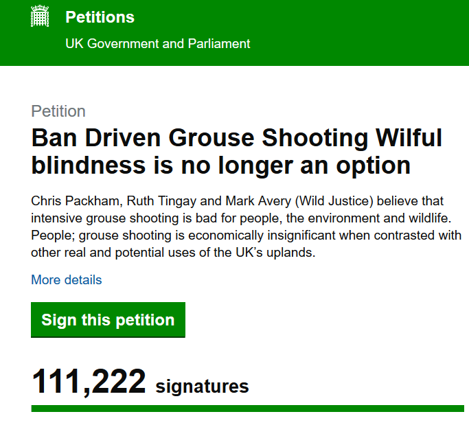Wild Justice is looking forward to the day when our successful e-petition to ban driven grouse shooting will be debated by backbenchers in Westminster Hall. Ours was one of very few e-petitions to have reached 100,000 signatures before the general election – in less than 20 full days in our case.