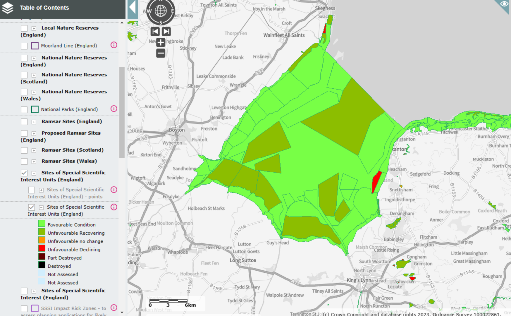 See? Now all the SSSIs, but let’s look at The Wash, are shown with their units mapped and each unit is classified, by Natural England, as being in Favourable Condition or not. Obviously, it would be good if all the SSSI units were shaded in light green as Favourable Condition but the more you look closely the more you will find that there are SSSI units in Unfavourable Condition. Don’t be fooled by the areas classed as Unfavourable Recovering – it sounds good but often isn’t. Sometimes it just means there is a plan for recovery and there is a wide gulf between having a plan on paper and having the right action on the ground.