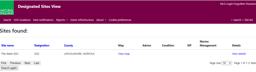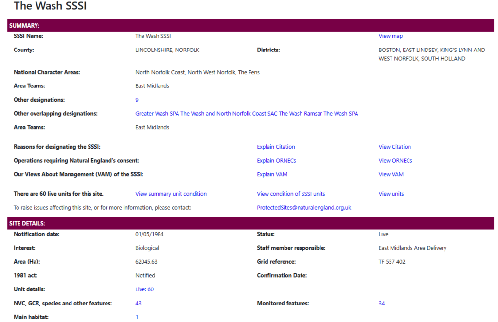If you pop the name of the SSSI into the form (make sure it is the right name, let’s choose ‘The Wash’) and press ‘search’ you’ll get a screen like this one;