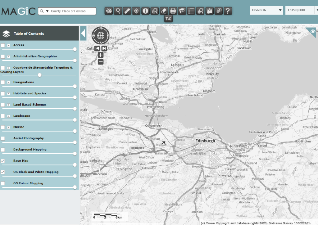We’re going to concentrate on SSSIs now as there are thousands of them across Great Britain and they are all mapped on the same online system called MAGIC. If you visit the MAGIC site – https://magic.defra.gov.uk/MagicMap.aspx – you’ll find a familiar map of GB with a complicated-looking table of contents on its left hand side. Let’s imagine you live in Edinburgh and zoom in a bit on Scotland’s capital. You’ll see something like this: