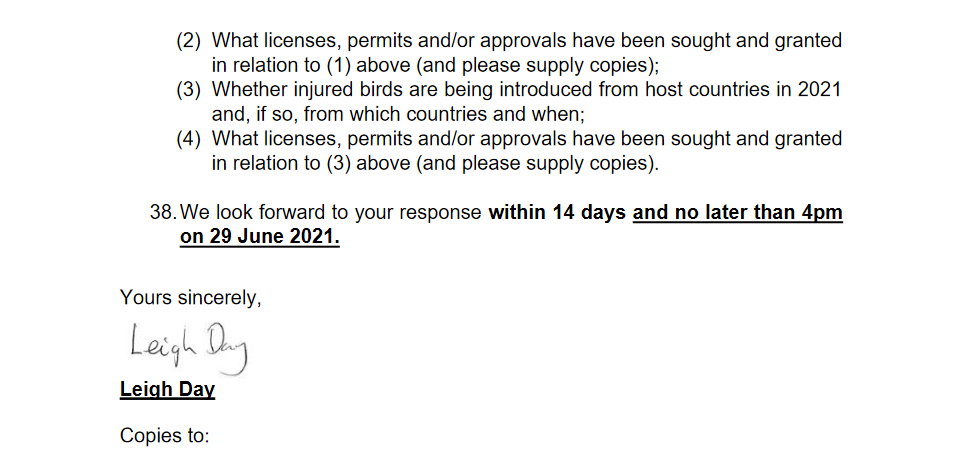 The easiest way to resolve this matter is set out in paragraph 36 below and would require NE not to go ahead with any releases in 2021 and to undertake a high quality assessment with the input of independent experts before going ahead.