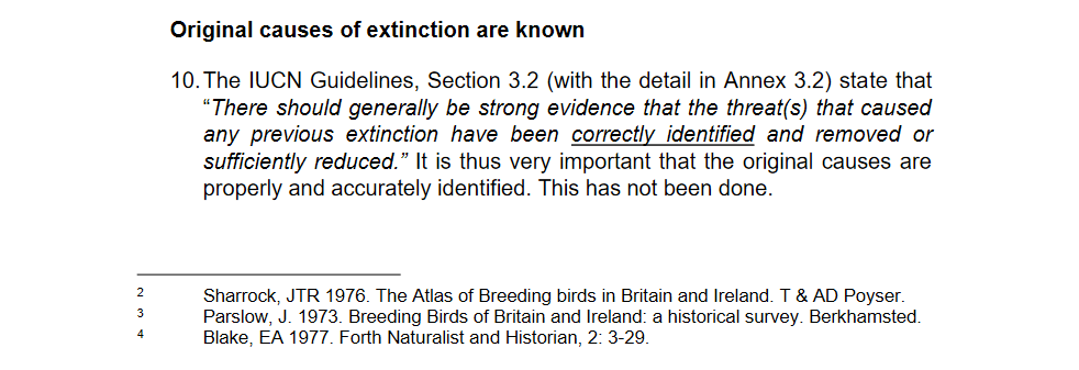 Wild Justice does not think that the Assessment carried out by Natural England is of high enough quality to form a safe basis for a reintroduction project. We are happy to concede that a proper assessment, carried out well and referring to all relevant data might (or might not) show that the proposed project might (but also might not) meet the criteria set out in the IUCN Guidelines.
